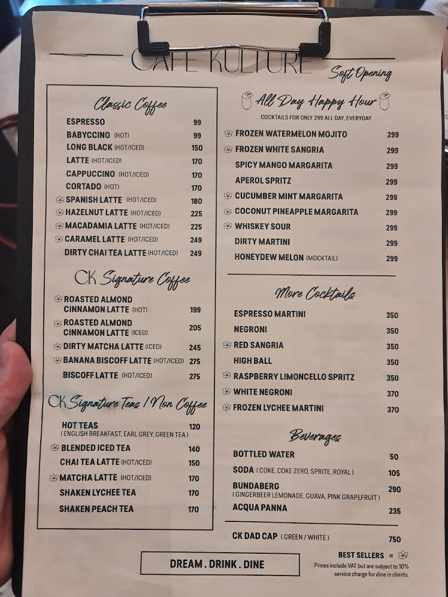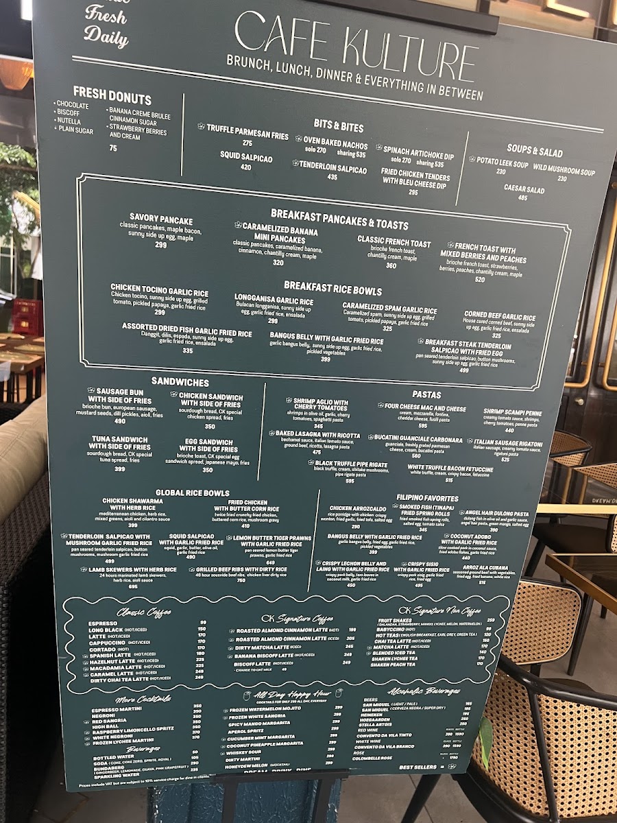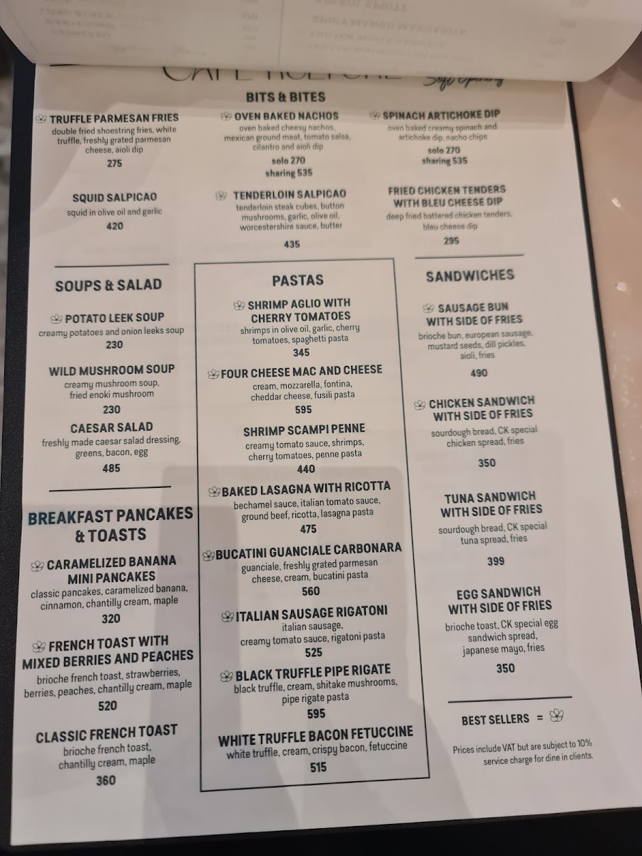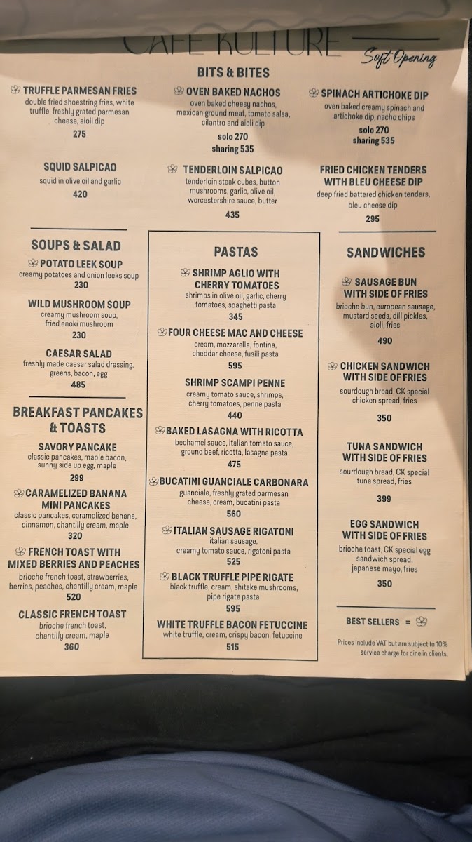 This menu is designed for casual dining experiences, suitable for quick orders or relaxed meals with friends or colleagues. The variety allows visitors to choose from light snacks or more filling food options depending on their needs.