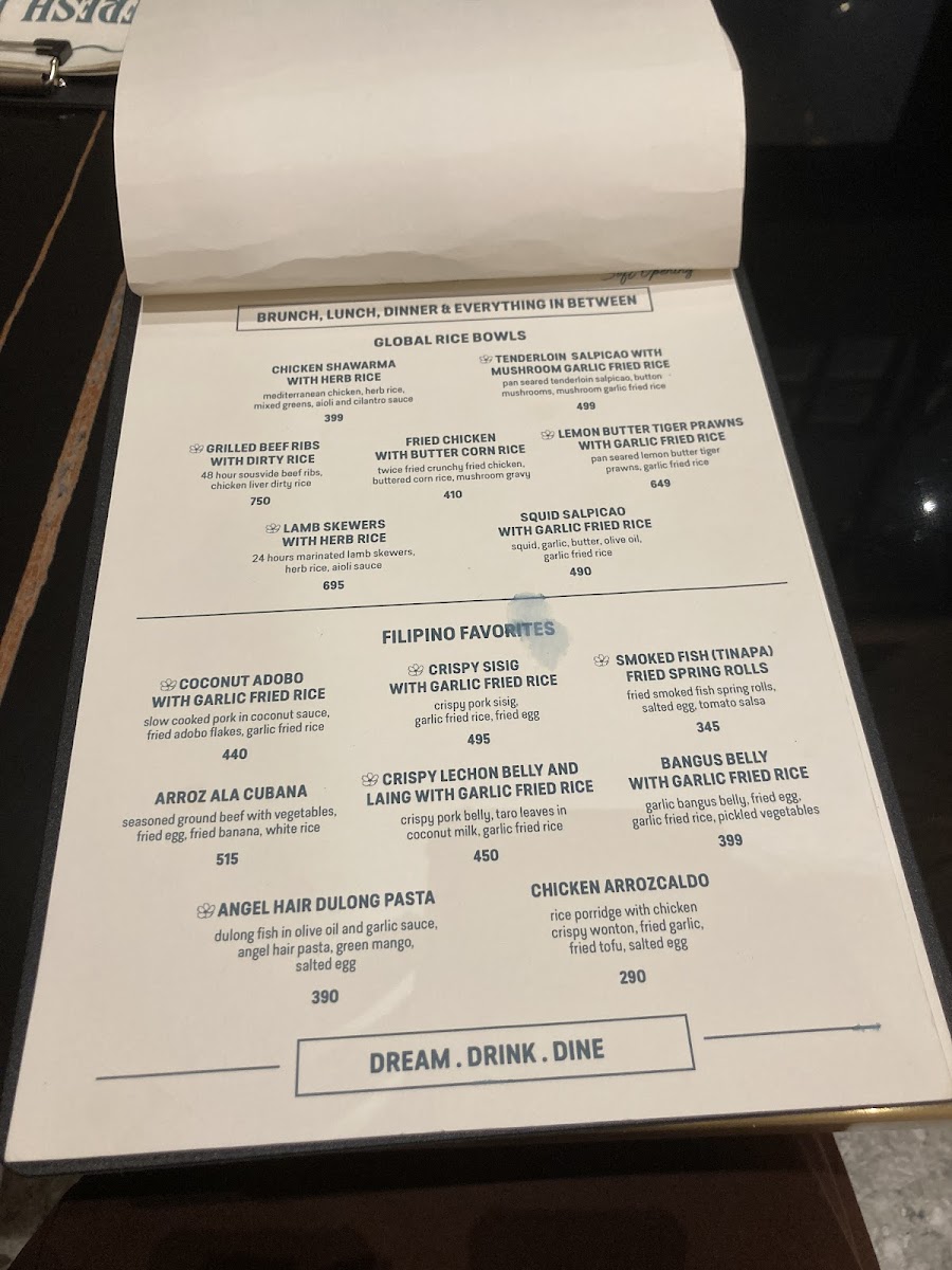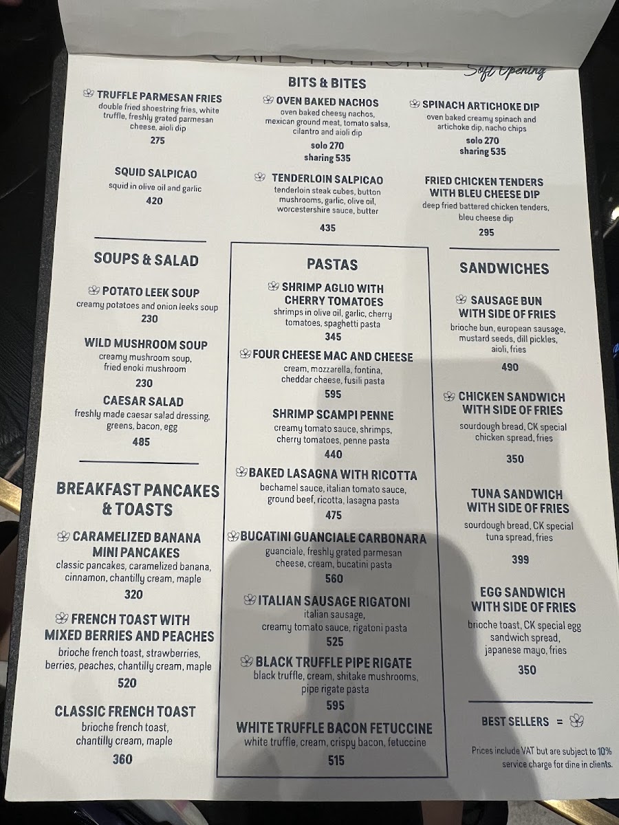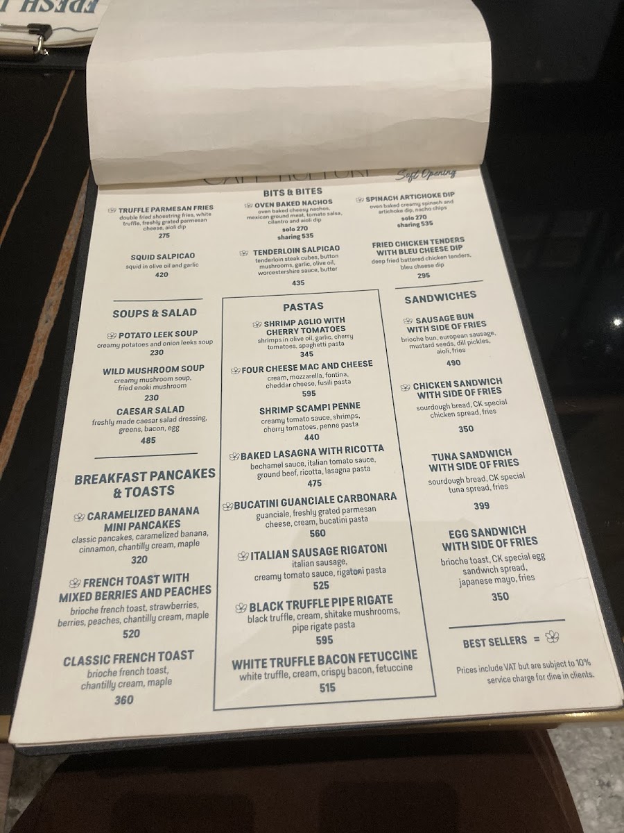 The menu is generally structured into categories such as drinks, appetizers, pasta dishes, and main courses. Drinks include coffee-based beverages and iced teas. Appetizers cover items like truffle parmesan fries and spinach and artichoke dip. Pasta selections include traditional and creative varieties. Main dishes encompass seafood, grilled meats, and rice plates.