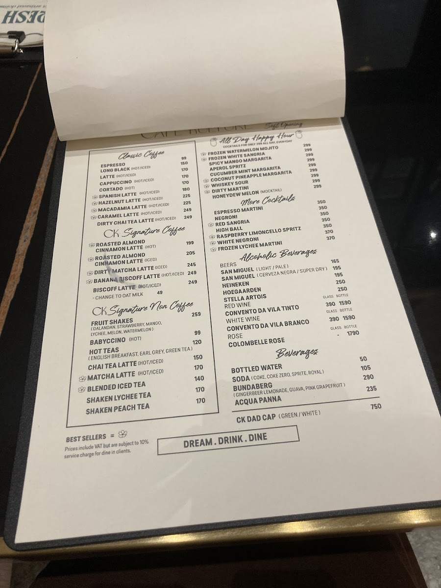 The menu offers a variety of options suitable for different dining occasions, including breakfast, coffee breaks, and light meals. It features a selection of drinks such as specialty coffee, lattes, blended iced teas, and shaken fruit teas. Food choices range from appetizers and light bites like dips to more substantial main dishes including pasta, seafood, and grilled items.